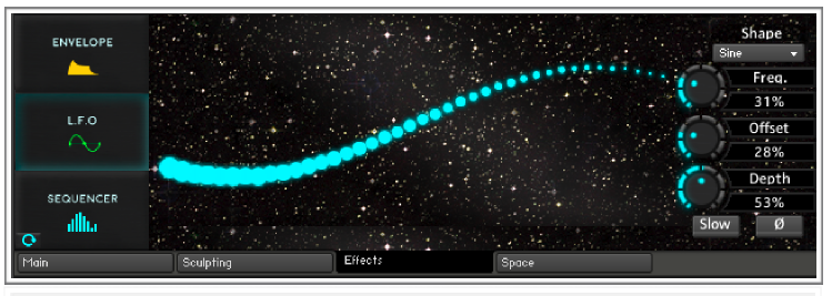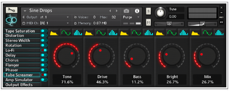 The Effects Page is really where the magic happens with this instrument. It’s laid out in two main sections. The top offers access to the parameters of several available effects such as tape saturation, delay, chorus, time screamer, etc. Turning on an effect reveals access to its parameters and the ability to select one of three modulation sources for each: Envelope, LFO or Step Sequencer.