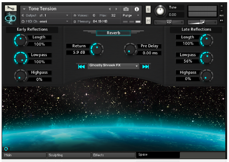 The Space Page, as the name implies, offers controls for a convolution reverb that includes 190 custom IRs.
