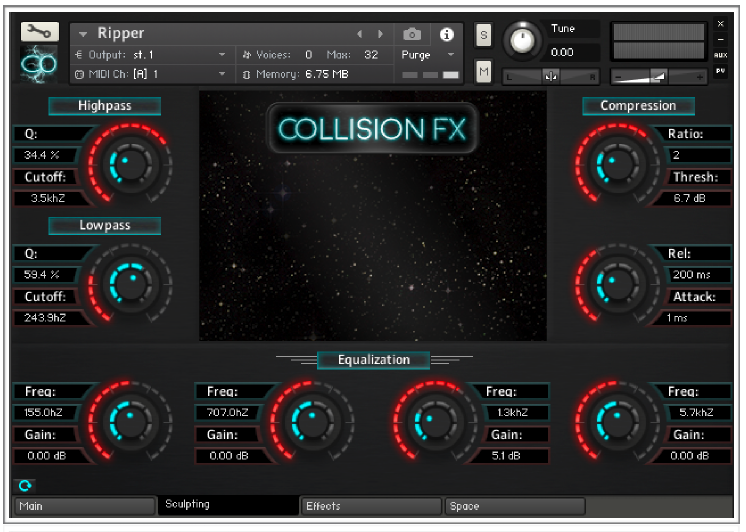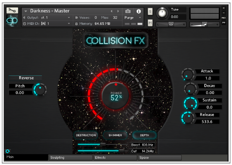 My criticisms of Collision FX are relatively minor. Some tabs could have been named more appropriately, specifically the Shimmer and Depth Tabs are somewhat deceptively labeled based on their actual function. The center control on the Main page causes intermittent clicks and pops when adjusted as a sound is playing, which limits its playability in real time due to these unwanted artifacts. It would have been nice to have pre-configured Key triggers for FX settings, especially since the instrument does have a fairly robust processing section.