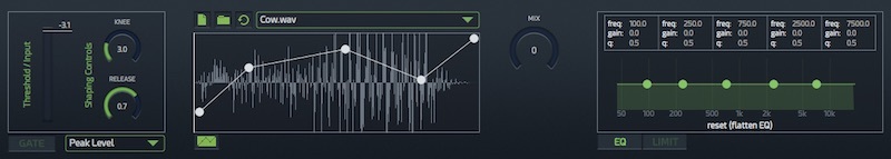 These are the controls for the Scrubbing Convolution Node. On the input, every node has a gate, and on the output, every node has an EQ and Limiter. You can really absolutely tailor the sound you want from each node, in great detail. On nodes such as the scrubbing convolution or the sample trigger, they have included a library of 100 animal recordings for you to base your creations on. These built-in samples can be easily augmented with your own.