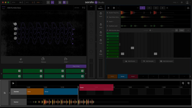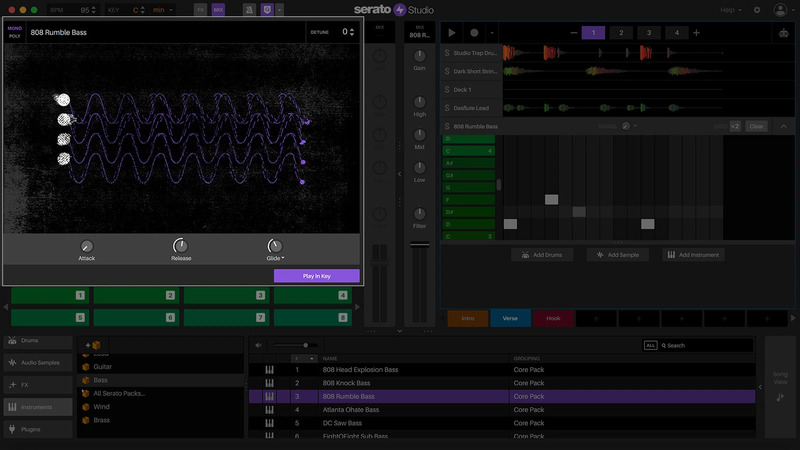 Start with some chords (use a major key for a happier-sounding song, a minor key for a darker-sounding song). You can use the ‘Play in Key’ option in Serato Studio which removes any notes that aren’t in your song key.