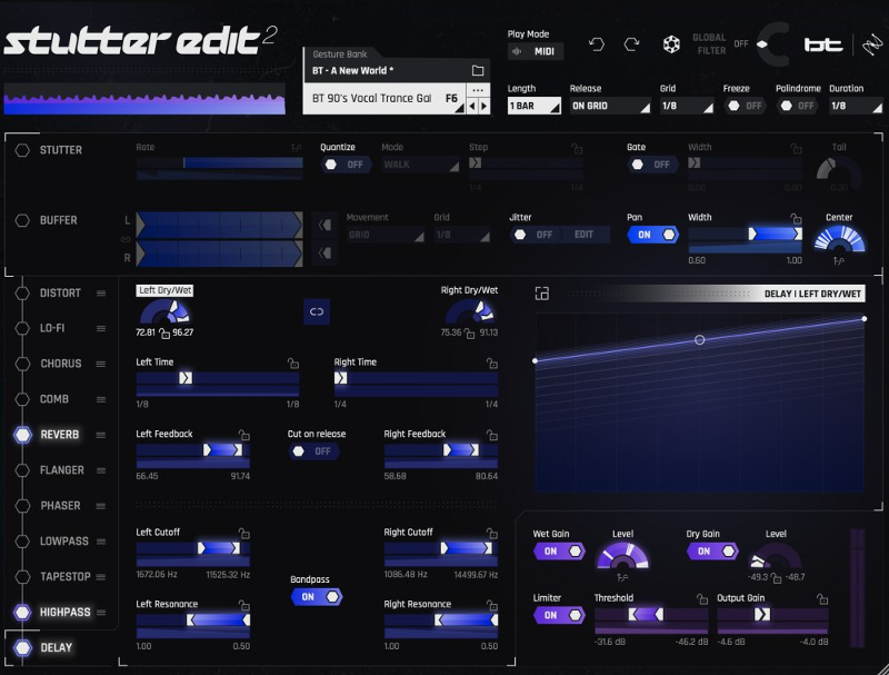 You can use Stutter Edit 2 in either Auto or MIDI mode, with the former syncing to the internal clock of your DAW and the latter reacting to incoming MIDI notes. The plugin has a large bank of ‘gestures’, which are the effect events we spoke about previously, including cinematic rises, exciting transitions and club filter sweeps. There’s a handy purple bar that gives you a visual representation of what’s happening to your audio, and you can customise gestures for length, release, direction and more, as well as editing modulation curves in the TVM (Time Variant Modulator) grid that affect the stutter itself.