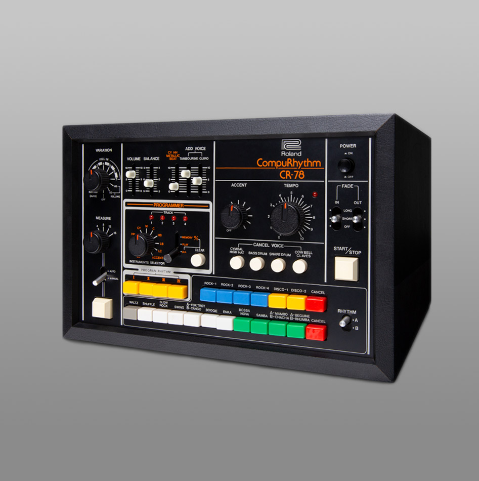 Although Roland’s aim was to develop accessible machines that replicated the sound of real drums, technological limitations meant that storing and playing back recordings of acoustic kits would have been too costly. Instead, the Japanese brand opted to use analog synthesis to emulate a number of traditional drum sounds as authentically as possible. Just two years after the launch of the CR-78, Roland released the TR-808.