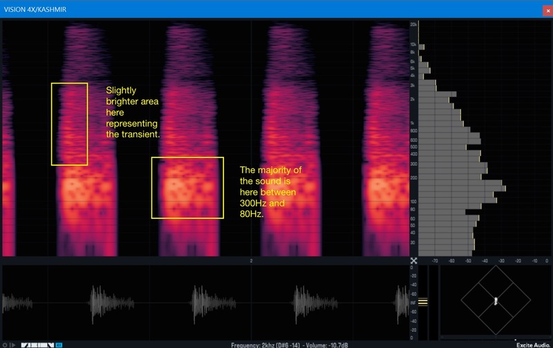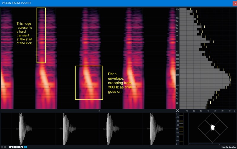 If you look at the bottom half of the Noisia kick drum represented on the spectrogram, you can see where the sound transitions out of the transient with a pitch envelope dropping from 300Hz to around 60Hz as time goes on. The high frequencies drop out very quickly, settling within a few milliseconds on the low pitch, which makes this a very tight electronic kick.