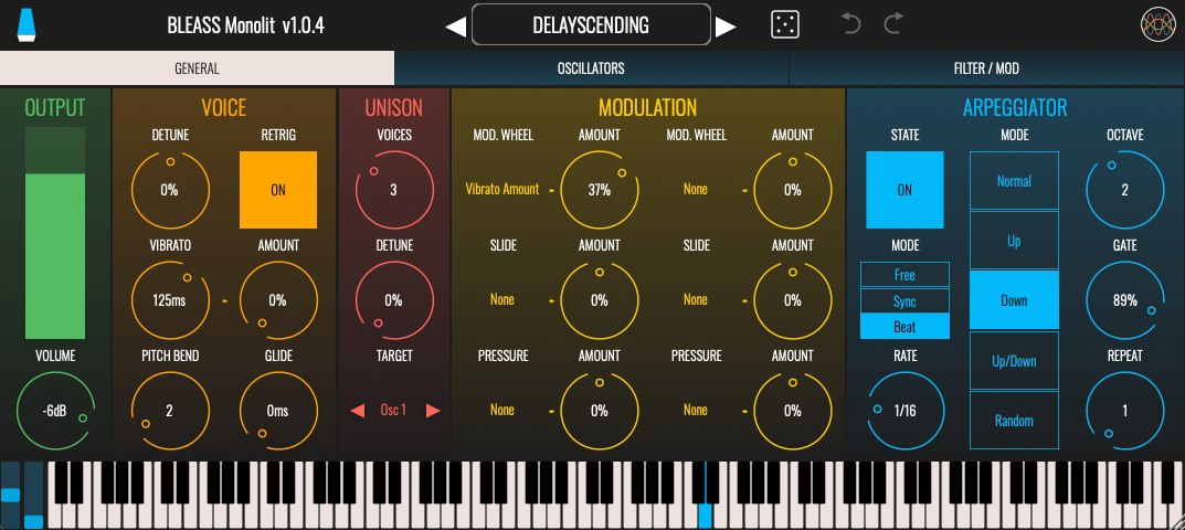 Despite being completely free of charge, the next synth we’re exploring here packs a serious punch. BLEASS Monolit’s efficient layout consists of three tabs: General, Oscillators and Filter/Mod.