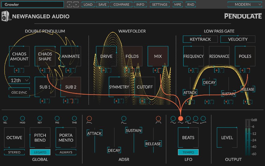 Pendulate also features a Buchla-style Wavefolder that can be used for creating distorted harmonic tones, perfect for big gritty basses. Finally, a low pass gate – another West-Coast synthesis feature – lets you control the final tone of your newly synthesized sounds using the inbuilt ADSR envelope, key tracking, velocity or even with pressure using your MPE device. This unique little free synth opens up a wealth of unique options for exciting bass design.