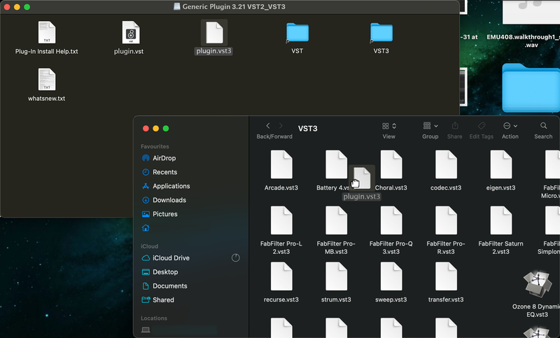 5. Drag and drop VST and VST3 files from the opened .dmg folder into your new Finder window’s corresponding folders. For example, open the VST folder within the .dmg folder and drag its contents into the VST folder in your Plug-Ins folder. If you’re using Logic Pro, make sure to drop the .AU and .Component file to their corresponding folders as well. For Pro Tools, use the AAX file.