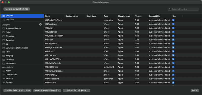 Once inside a DAW’s plugin manager, the display and settings shown will be close to uniform across all DAWs. You’ll find a list of your scanned plugins with some information about each plugin, including file type, plugin name, developer, etc. Depending on your software, you may also be able to add plugins to your favourites from this list and enable/disable them from appearing in your DAW.