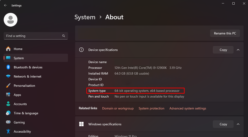 To find out the bit type of your Windows machine, you can follow the steps below. Please note that these steps are for Windows 11, specifically. Your system type can be found on previous versions of Windows by navigating to the This PC section of the settings and clicking System Details.