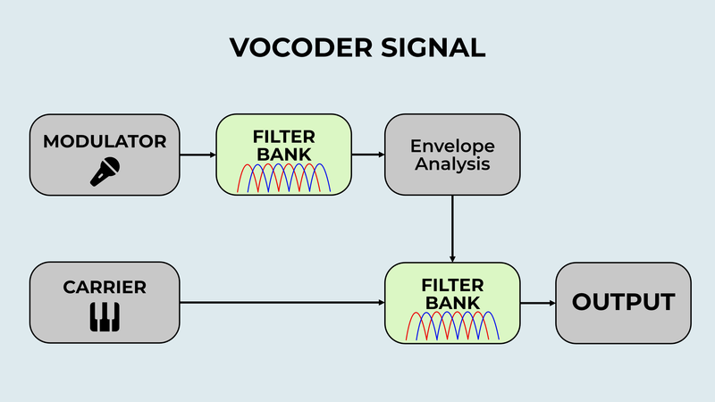 Analysing the level of each filter for the modulator signal, and how it moves over time, the vocoder takes the changing level of each filter and applies that changing level to the same band over the carrier signal. The modulatorâs frequency-band energy over time is now mimicked by the carrier signal, and this is sent to the output of the vocoder.
