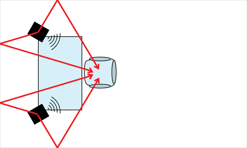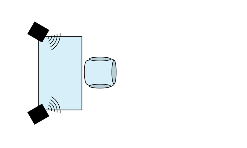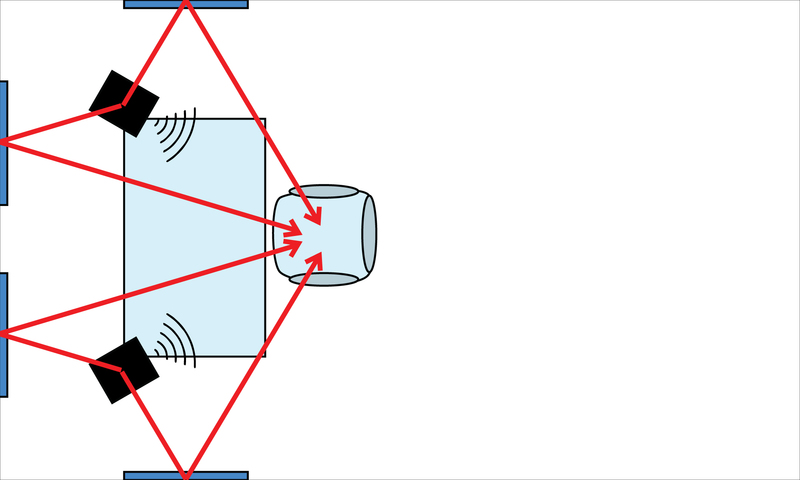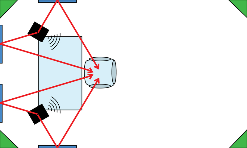 In our new diagram, above, weâve added little grey triangle shapes in the corners of the room, representing bass traps.Â