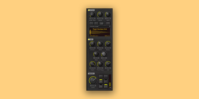 BigKick’s simple layout includes a sample section at the top of the plugin, designed for creating the attack section of your kick. Within it, you can set two different samples and independently control their settings. The synthesiser section below is for creating the body of the kick, and lets you adjust the amplitude and pitch settings of your sound.