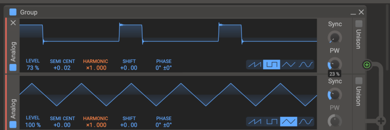 Our Phase Plant patch uses a pair of triangle waves as the key component. Only one property, their Harmonic amount, is being controlled by a modulator (the envelope). We start by changing one waveform to a square wave, and adjust its pulse width (PW), which has a fair impact on the sound.