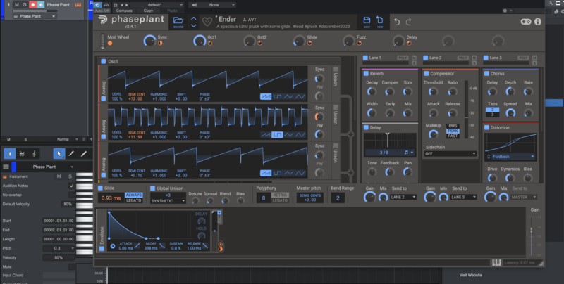 Let’s take a look and a listen to a synth patch’s envelopes and what they do or the sound. We’re starting off with a new patch in Phase Plant to demonstrate this one. The patch name is Ender, and the character is a short pluck with some delay and reverb on it.