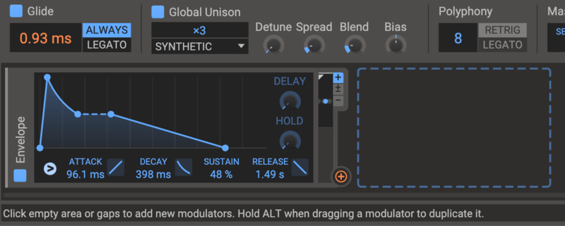 Right now, the envelope’s Sustain is set to 0, meaning that the Attack and Decay stages are the only real, active parts. By increasing the Sustain, we also bring the Release into play, making the patch act like a more traditional, ADSR setup. More to the point, the sound of the patch itself has changed very much, opening up a new, unique version for us to make our own.