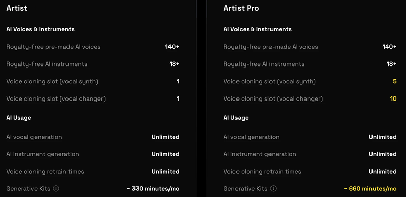 AI vocals, AI instruments, voice cloning, stem splitter, music generator, and more