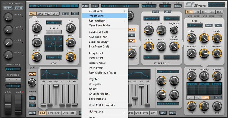 2. Open Spire within your DAW and select the 'Menu' button > click 'Import bank'.