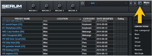 7. Close and reopen Serum before clicking the ‘Browser’ folder icon/tab (as highlighted by the yellow arrow below) on the left-side of the ‘Menu’ tab, and you will then see your presets in the list (as shown below). Double-click your preferred preset to load it into Serum.