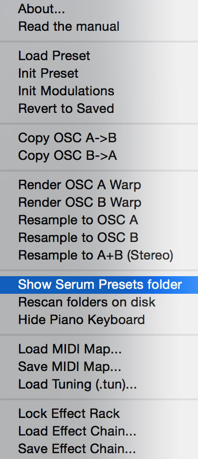 4. Click the ‘Show Serum Presets folder’ option > this will open the location of Serum’s entire available content within the 'Serum Preset' folder directory.