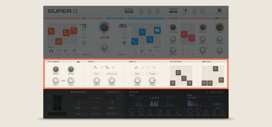 - Super 8 makes it easy to tweak your sound through a clean, next-generation interface. Use simple sliders to blend up to four waveforms for each of the two oscillators. Mix the oscillators, sync them, and fold in FM oscillation for a digital edge. Apply low-pass, band-pass, or high-pass filtering, then use ASDR sliders to make quick changes to filter and amplifier envelopes.