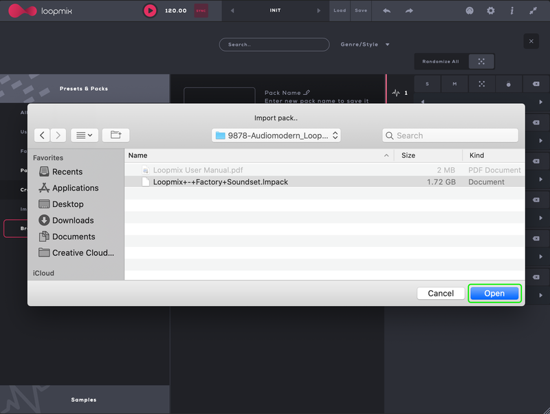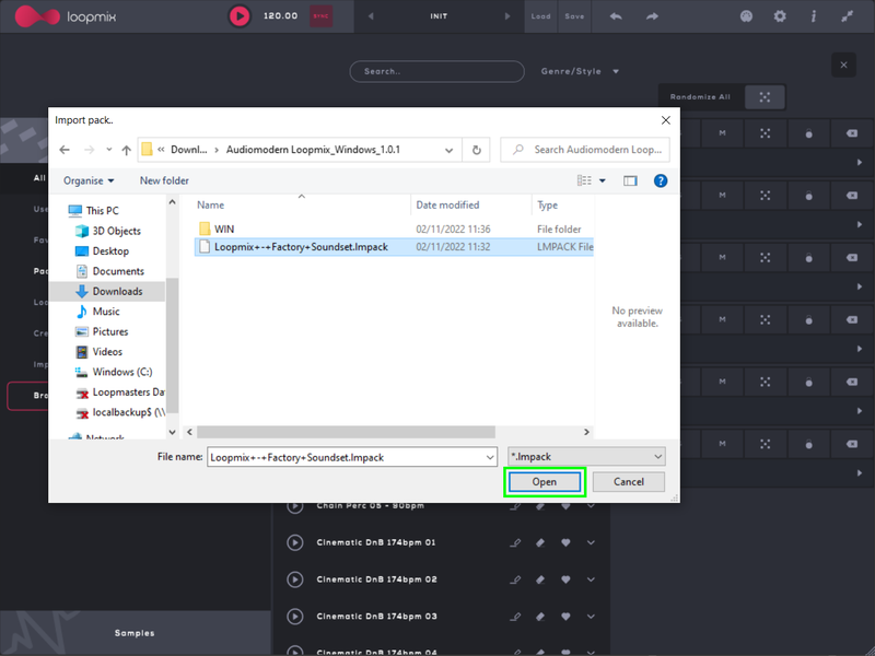 3. Locate the LMPACK Factory Soundset file within your downloaded .zip folder entitled 'Loopmix+-+Factory+Soundset.lmpack' > select the file and click 'Open'.