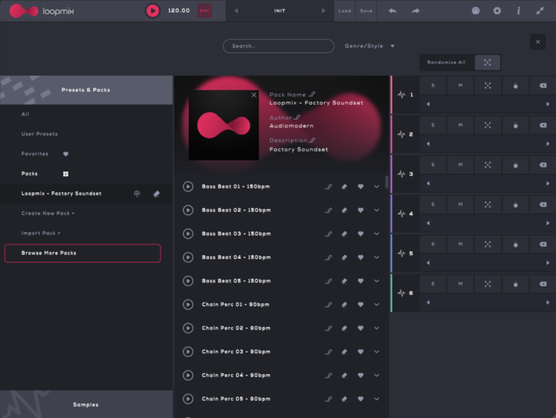A specially built loop machine both for Studio & Improvised live performance. Load up to 6 loops and let Loopmix generate infinite variations based on Sequencer, Rearrange, Reverse, Density, Volume and Pitch. Hit Random, or use its signature Randomization Algorithms: Remix, Infinity, Disintegration mode, Track based Randomization, Temporary Randomization and much more...