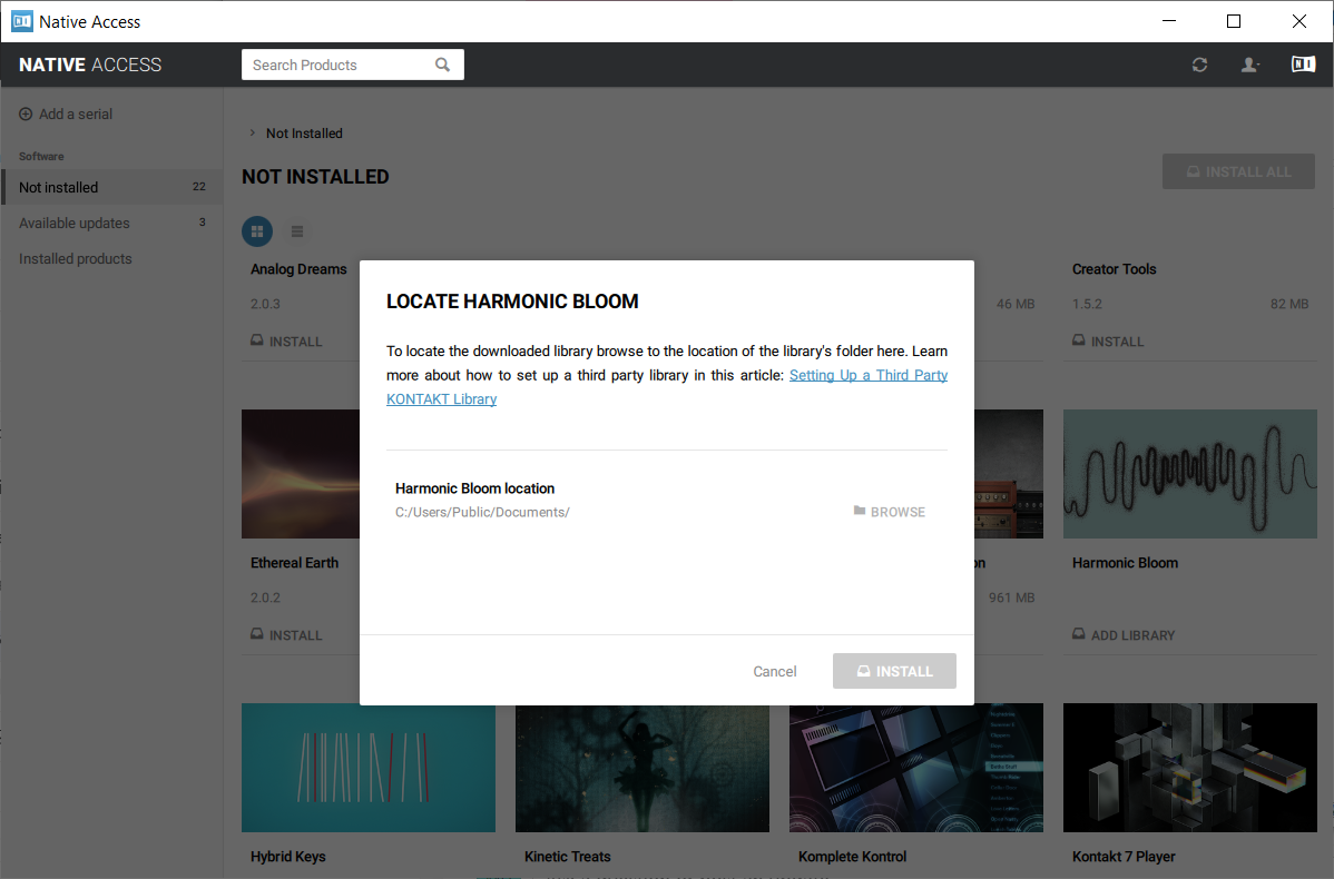 8. Click 'BROWSE' and locate the downloaded Harmonic Bloom folder in your files > Select the folder and then click 'INSTALL'.