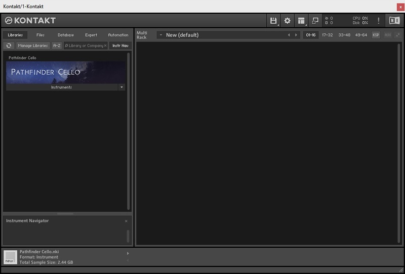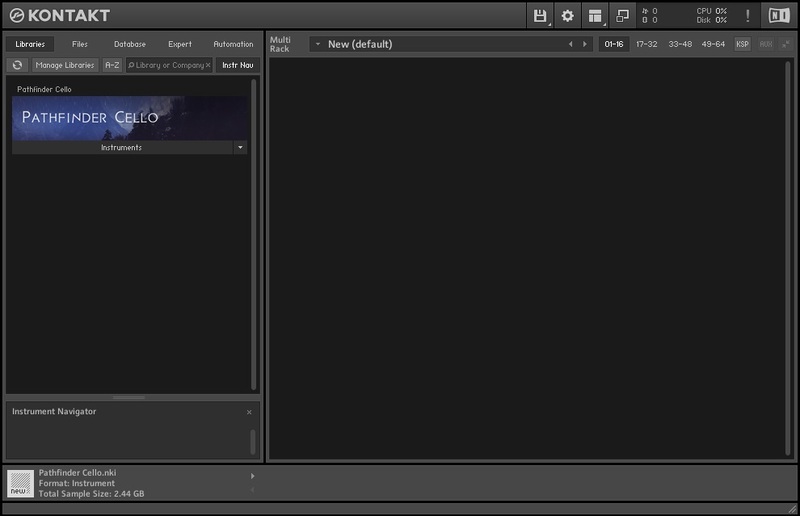 14. Open Kontakt in your DAW > You should see Pathfinder Cello on the left sidebar > Click the drop-down bar and drag the .nki file into the middle of the window.