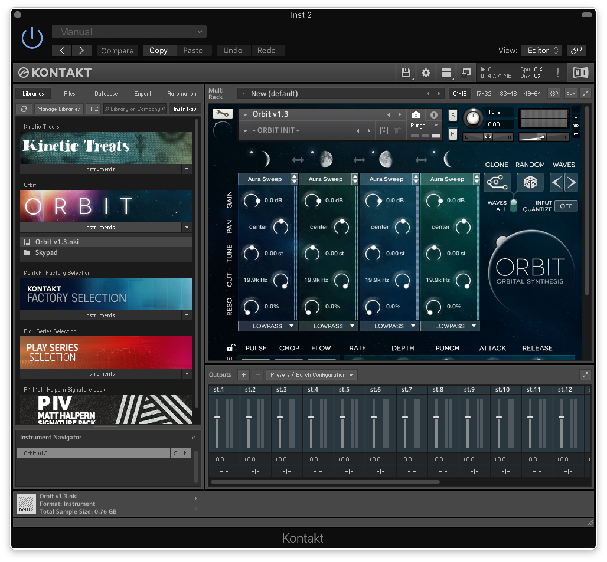 Welcome to a new kind of musical instrument for Kontakt, ORBIT, designed for easily creating stunning synths, pulses and atmospheric textures. With our critically-acclaimed intuitive interface, you can create rich, deep results in the blink of an eye. Power meets simplicity.