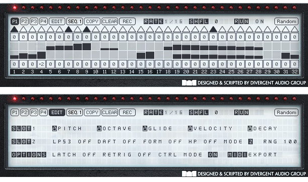 Divergent Audio Group's most advanced and dynamic sequencer allows control over Glide, Pitch, Velocity, Note Length, Cutoff, Resonance, Lofi, Phaser, Flanger, Chorus and Reverb. Includes advanced Randomisation modes and Trigger modes such as Latch and Retrigrigger as well as midi export for all generated patterns.