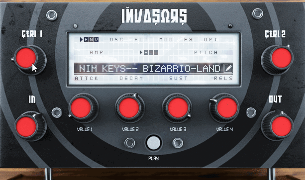 Invasors has a truly unique approach to interface navigation. Using just 4 controls you can scroll through the menu options as if you are controlling a piece of hardware. This allows you to assign midi controllers to the main knobs and control Invasors remotely.