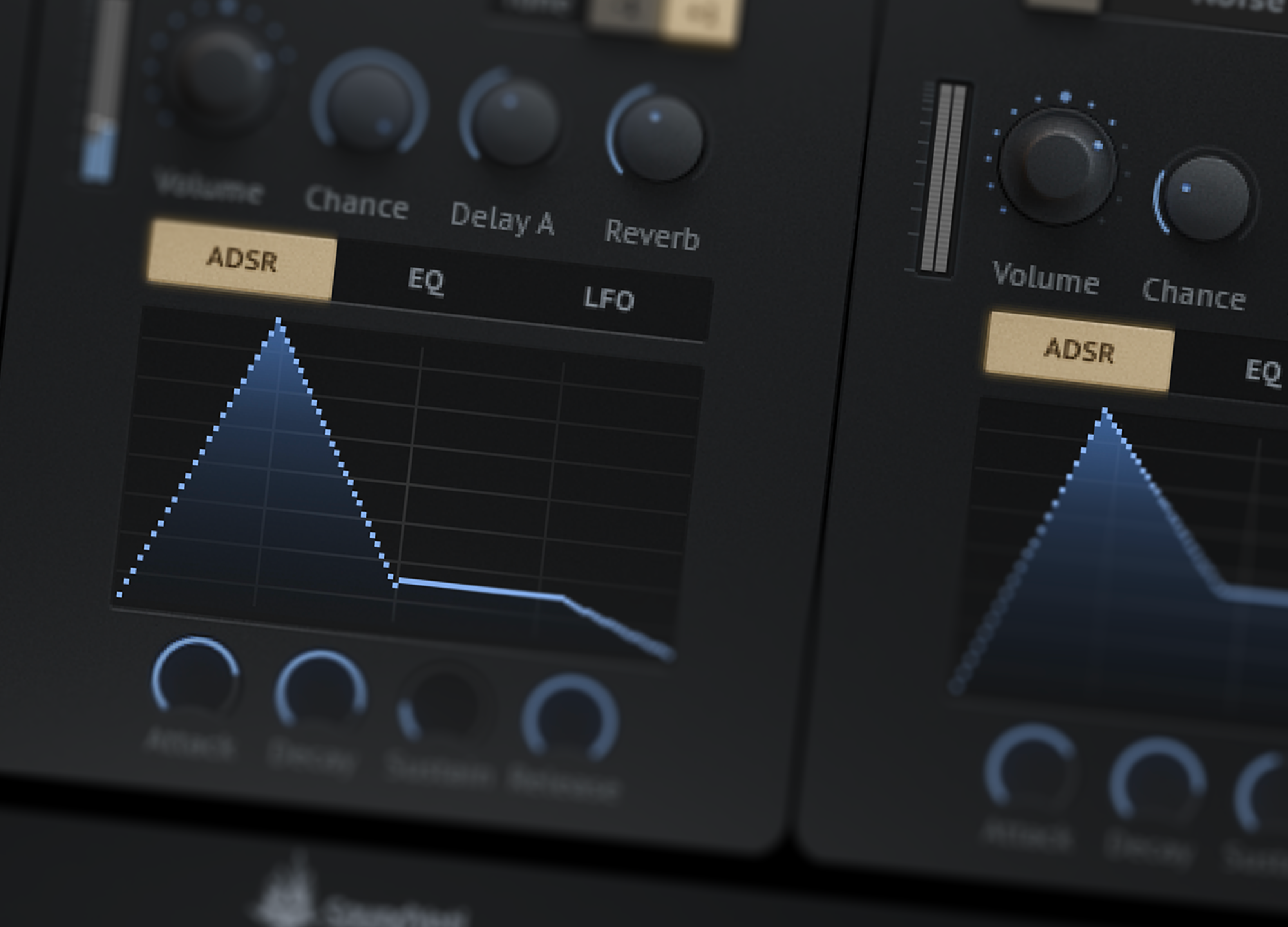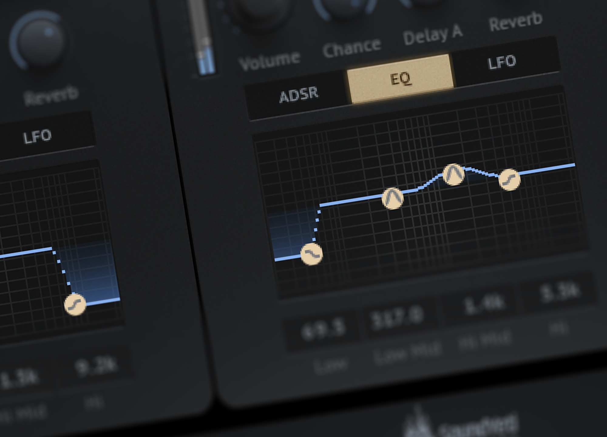 Each stereo layer is accompanied by a combo of sound molding tools; ADSR, Delay, Reverb with 24 custom IR environments, 4 Band EQ and Sound Yeti’s proprietary LFO design with tempo sync, resonance, wave shape selection, fade in control and awesome LFO visualization. Thinking of taking the power trio on tour as the headliner? Simply mute the grand piano and you’ll find this trio is ready for top billing.