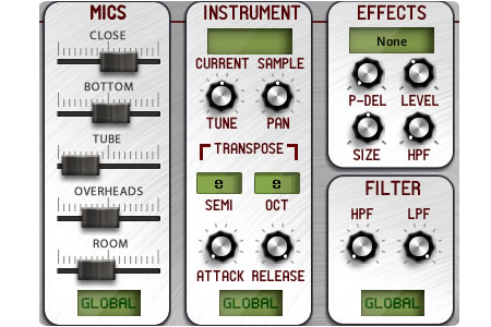 'Close'(Mono), 'Bottom' (Mono), Tube (Mono), 'Overhead' (stereo) and 'Room' (ambient stereo).