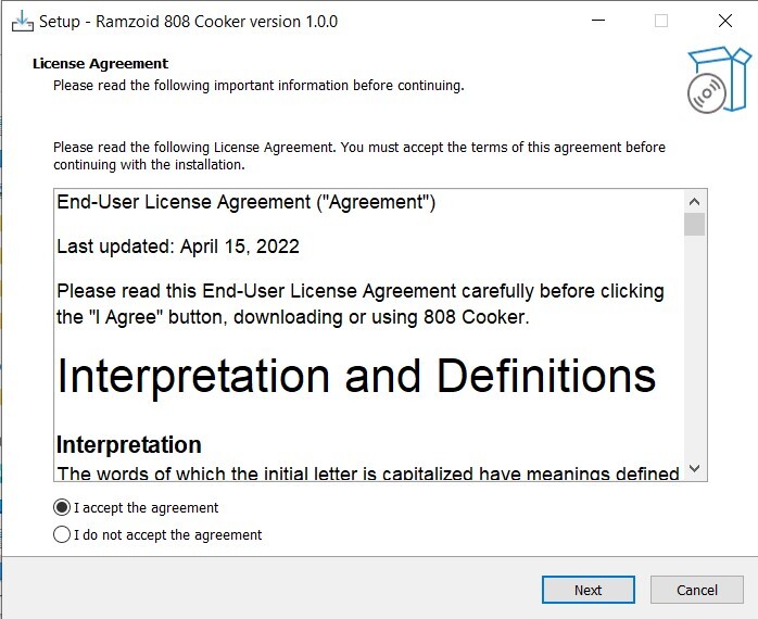 2. Select 'I accept the agreement', and click 'Next'.