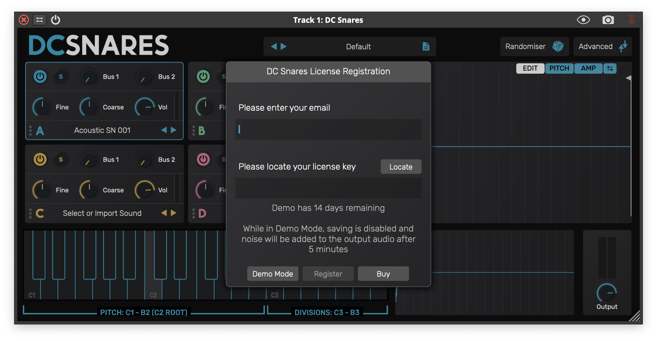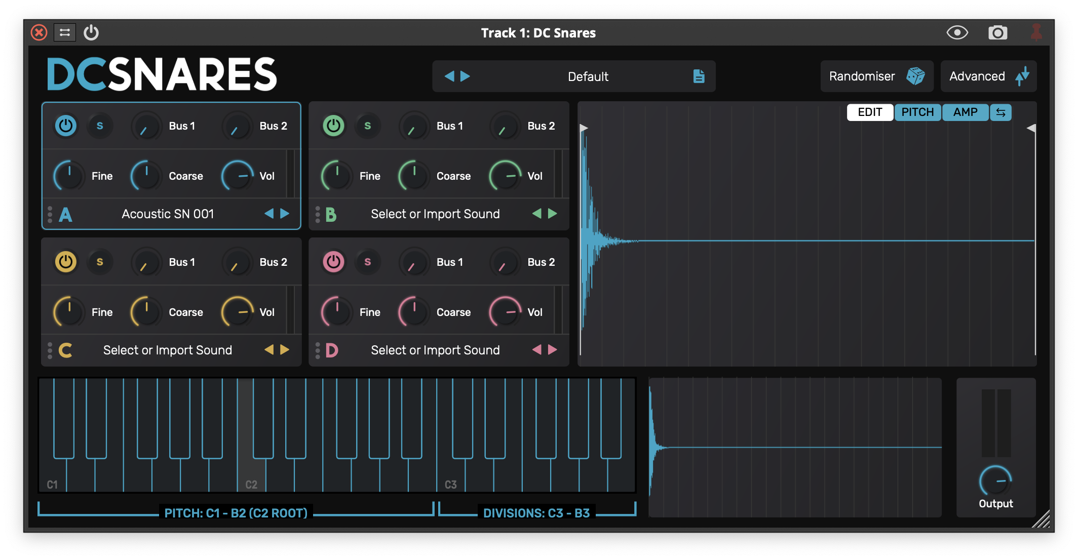 DC Snares thrives as a live instrument. Utilising a MIDI controller or the internal keyboard, pitch snares up or down, and create powerful rolls using note divisions.