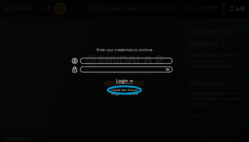 10. Launch your DAW > Insert MNDALA 2 on a new instrument track > Click 'Create New Account' (If you have an existing MNTRA Instruments log in and skip to step 15).