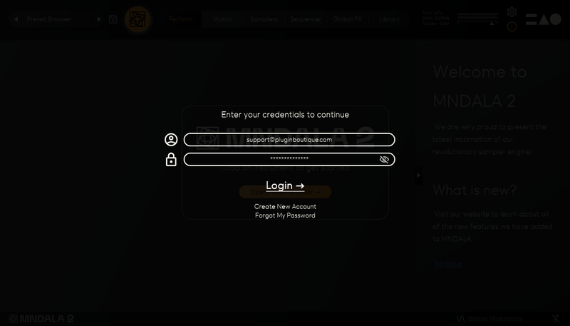 9. Launch your DAW > Insert MNDALA 2 on a new instrument track > Click 'Create New Account' (If you have an existing MNTRA Instruments log in and skip to step 15).