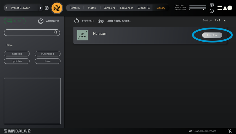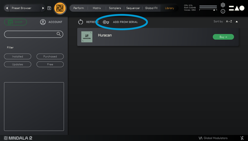 15. You are now logged into the MNDALA 2 Engine > Click 'Library' to continue to activate Huracan.