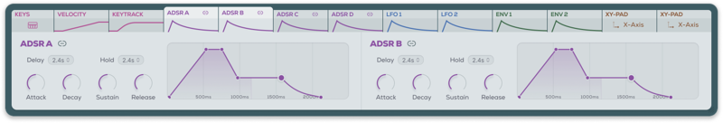 • ADSR (A/B/C/D) Parameters: Delay, Attack, Hold, Decay, Sustain, Release, Link
