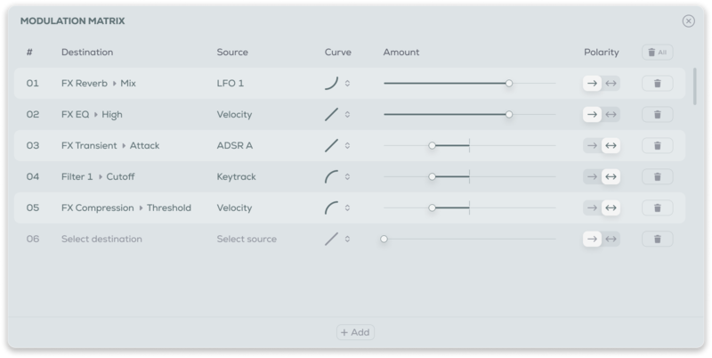 A full modulation matrix awaits advanced sound designers, showing all the assigned modulation routings as a manageable list. Parameters such as modulation curve and polarity allow even deeper customisation.