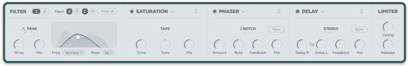 Dual filters allow each source (A, B, C, D) to easily be routed as inputs, and can be run in parallel or series by feeding one filter into the other. Both filters have a variety of filter curves, Cutoff and Resonance controls, filter Drive and Mix.