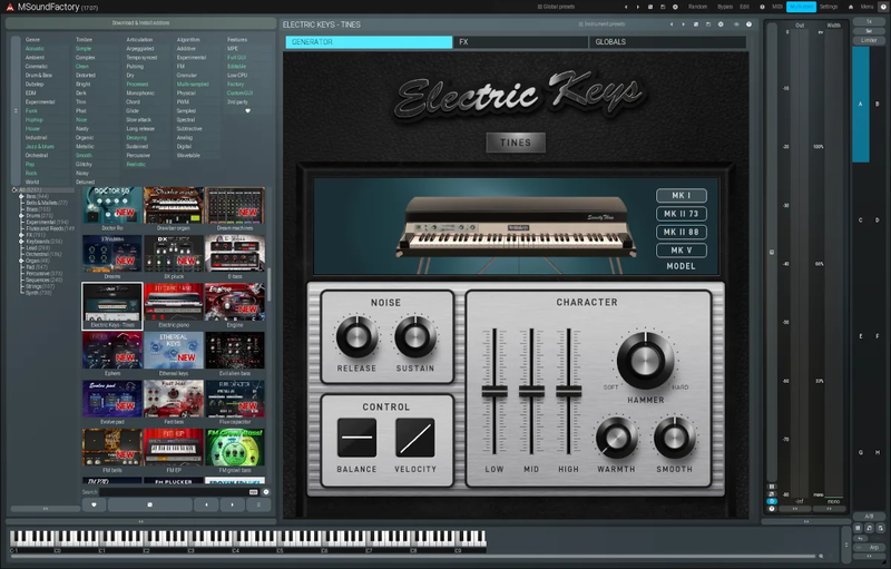 Electric Keys Tines is an MSoundFactory instrument dedicated to the legendary sound of tine-based electric pianos. It combines the mechanical soul of the late 70s and early 80s with modern precision, delivering the bell-like tones and gritty bark that defined a generation. With its hardware-inspired interface and focused controls, you can effortlessly add classic keys to your compositions without wrestling with complex synthesis. Whether for smooth R&B, driving funk, or classic rock, Electric Keys Tines is ready to infuse your music with unparalleled nostalgia.