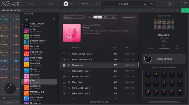 Perfect for building anything from dreamy pop ballads to hard-hitting dance anthems, this expansion brings sharp snares, tuned 808s, tight hi-hats, and shimmering textures, ready to drop into tracks inspired by BTS, BLACKPINK, SuperM, EXO, ITZY, NCT, Stray Kids, IVE, TWICE, BIGBANG, and NewJeans. Use XO’s powerful features to swap sounds for similar samples with the click of a button. Switch to your favorite sounds from your sample collection, or create wild variations by filtering on a specific range.