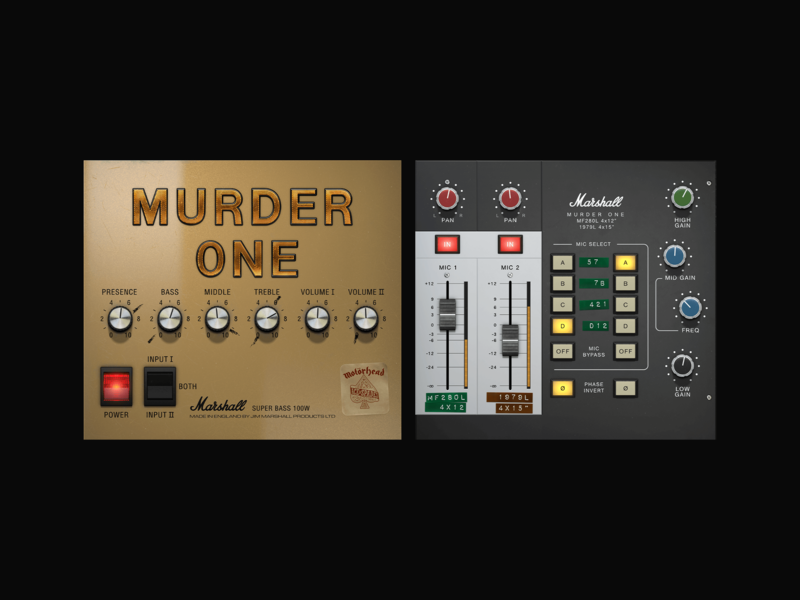 At his Maple Sound Studios in California, Motörhead's Grammy Award-winning producer Cameron Webb captured the precise cabinet setup Lemmy used in-house and on the road: a Marshall MF280L 4x12 ′′ and a Marshall 1979L 4x15 ′′. Murder One’s faders each represent a cabinet and the microphone selectors for the cabinets. You can blow out your guitar tones with the oversized 4x15 ′′ cab. Or mix and match microphones for the perfect setup.