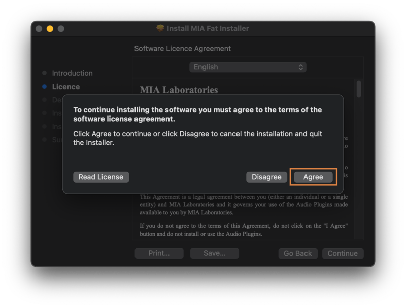 3. Read through the license agreement > click 'Continue' > click 'Agree'.