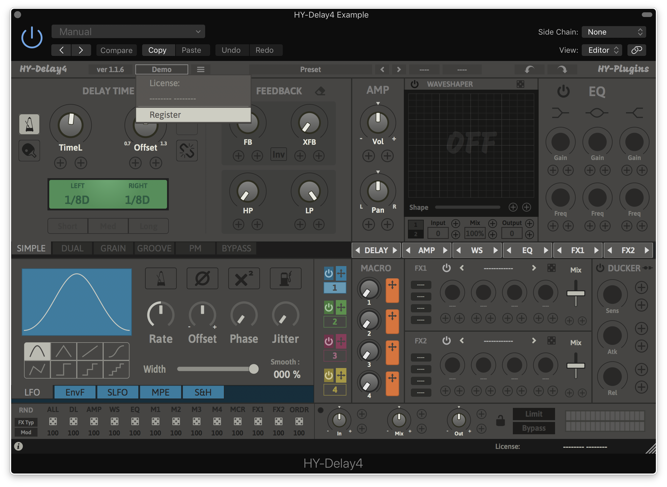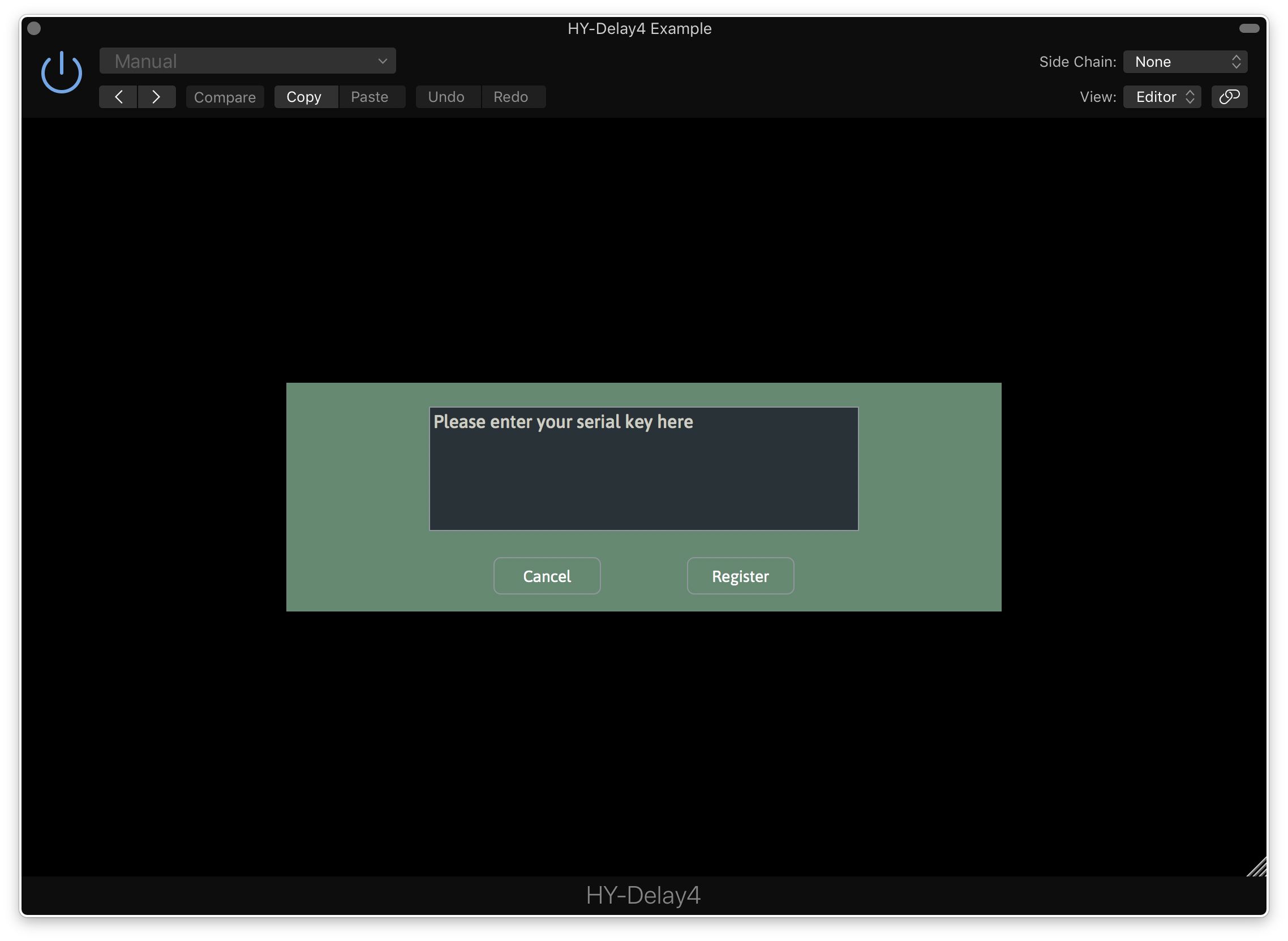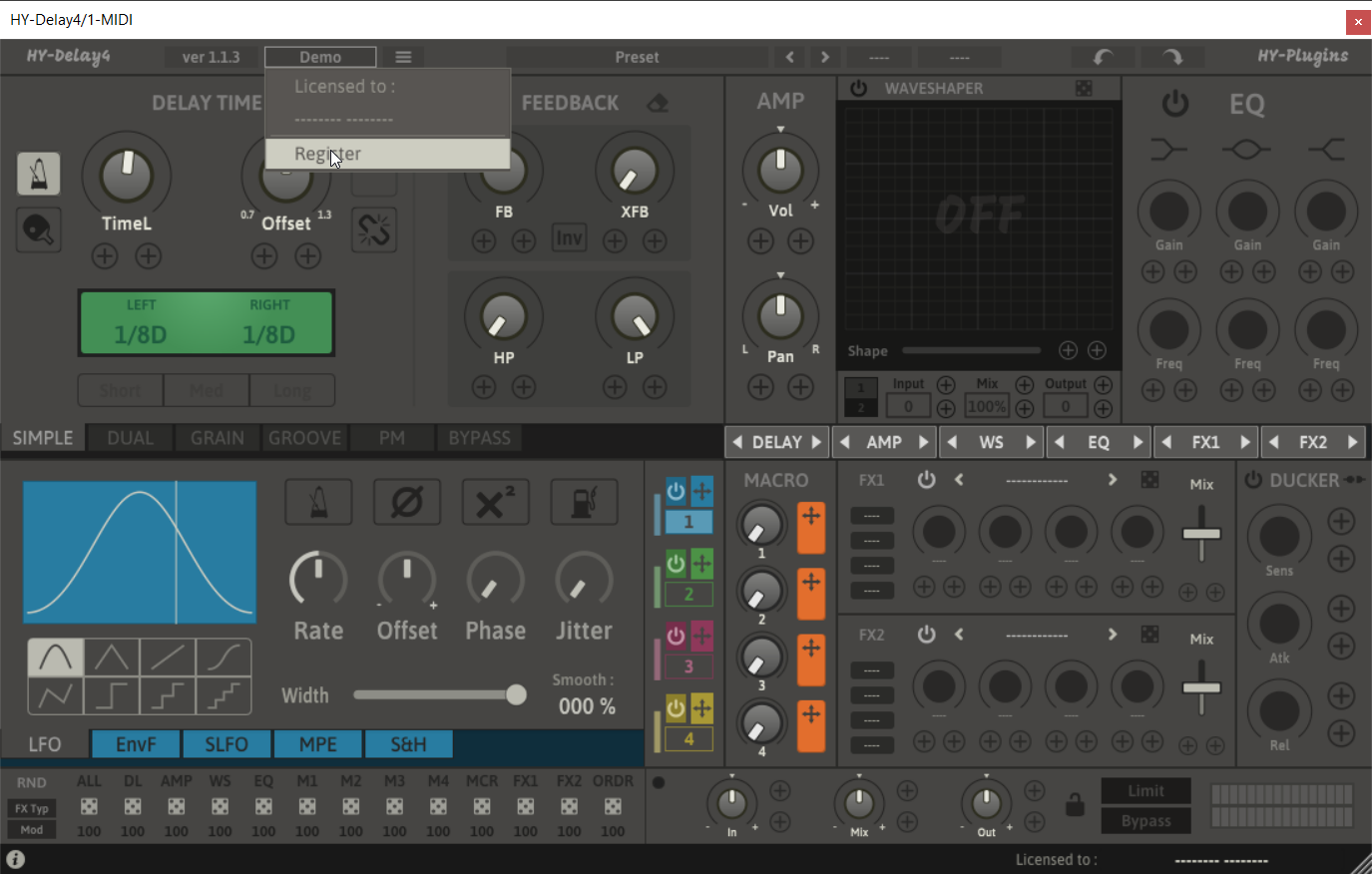 1. Open HY-Delay4 in your DAW > Click the 'Demo' dropdown and then click 'Register'.
