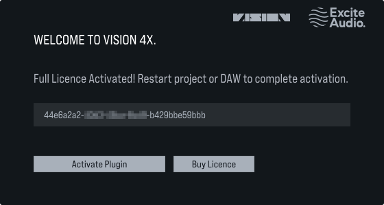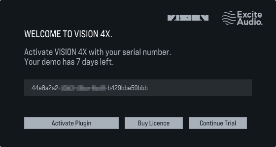 9. Launch your DAW > Insert VISION 4X on a new track > Paste your serial number found within your Plugin Boutique User Account into the text field > Click 'Activate Plugin'. (Or, activate from the standalone version located at: C:\Program Files\Excite Audio\VISION 4X).