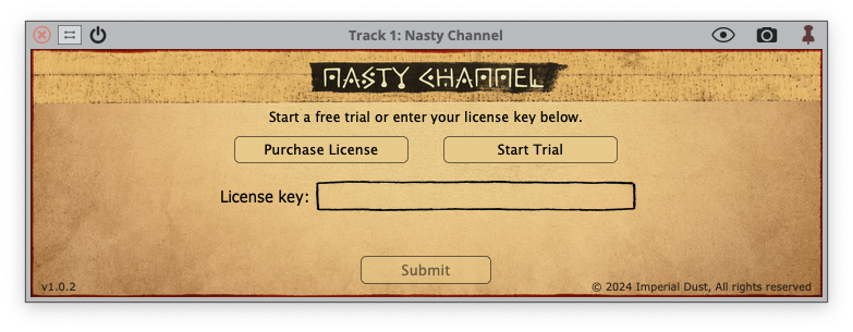 6. Launch Nasty Channel within your DAW, and enter the License key found within your Plugin Boutique User Account (listed under 'Serial Number'). Click 'Submit'.
