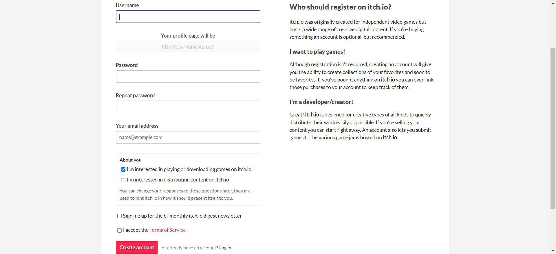 3. Click 'Create Account'. If you already have an itch.io account, log in and skip to step 5.
