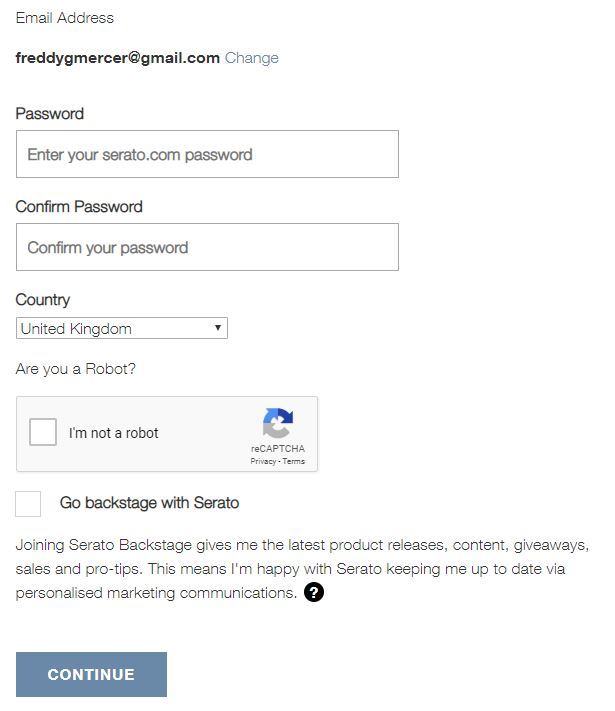 2. You will then be re-directed to a page where you can create a Serato account > Enter your chosen Password and click 'Continue'.